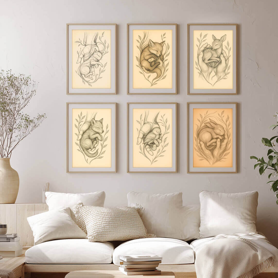 6 ilustraciones (zorro, gato, ciervo, gorrión, lobo y conejo) en formato 30 × 42 cm, con una paleta neutra y equilibrada, pensada para integrarse con elegancia en distintos espacios y composiciones.